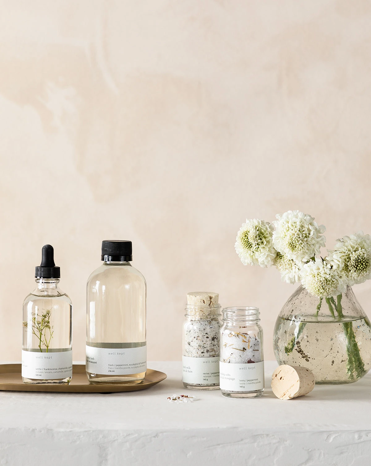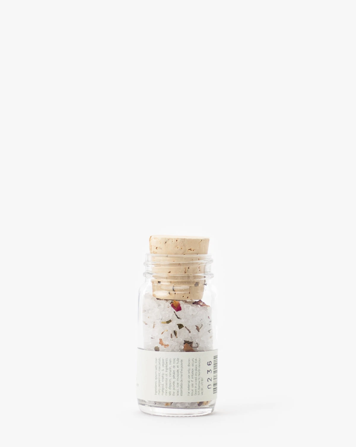 Kept in a simple glass bottle with a cork stopper, the Aromatherapy Bath Salts are made with natural ingredients. Intended to calm and soothe, the bath salts include epsom salts, peppermint, marigold, rosemary, rosehip, rose petals, and peppermint essential oil. Ease into self care by sprinkling the salts into your bath, swirling them around in the water until dissolved.