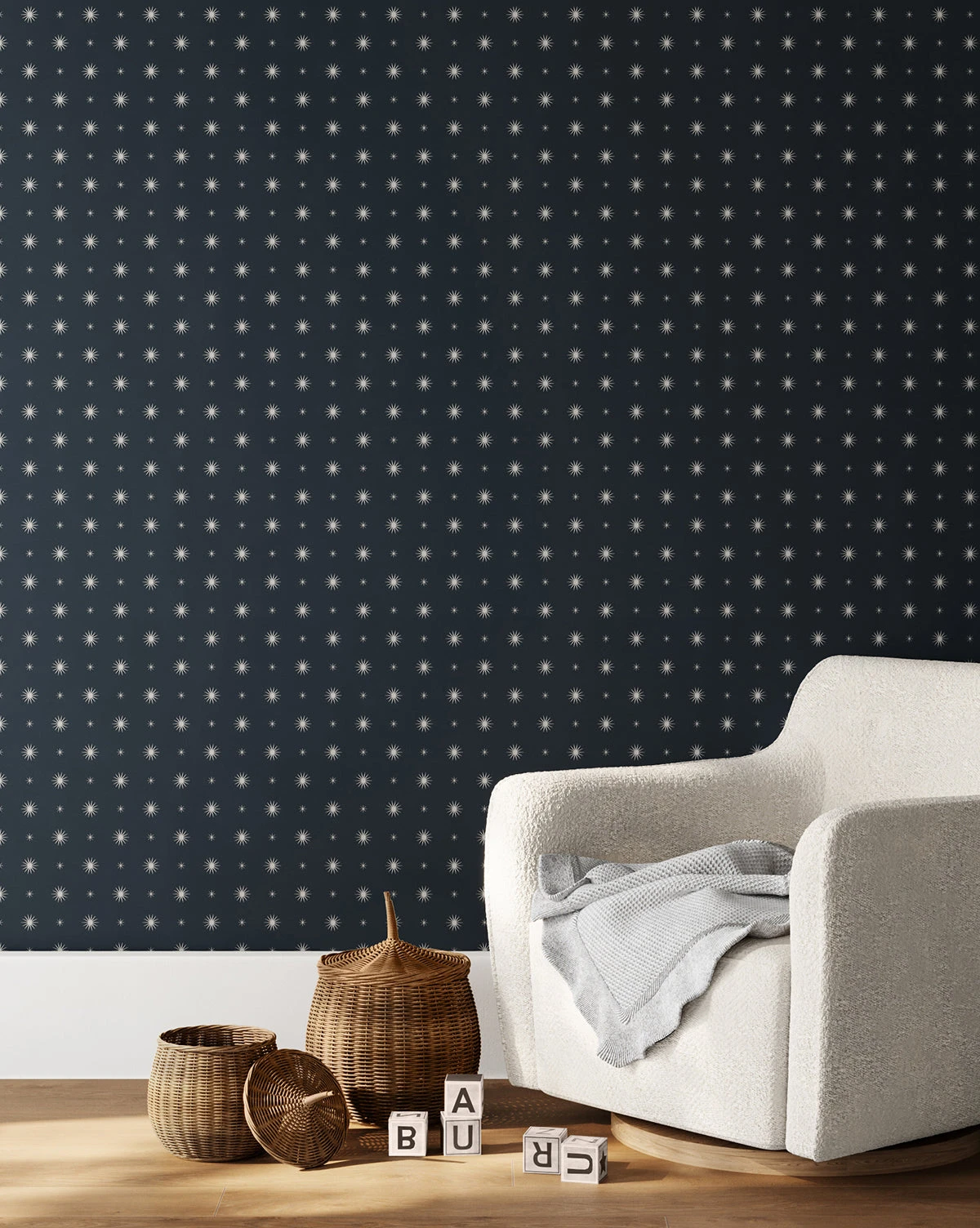 A rich navy, the Aster Wallpaper complements nearly any style. With subtle white dots that create a detailed and unified pattern, this printed wallpaper is a classic choice. Its design adds dimension and balance, creating a timeless feel for children’s bedrooms.