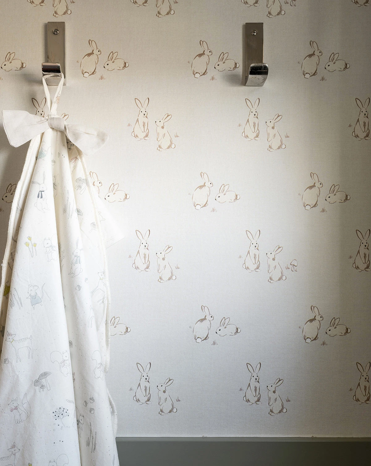 In a soft, pastel palette, Bunnies Wallpaper uses couplets of darling hares in its playful pattern. The muted green background complements the soft taupe bunnies and creates a pattern that is distinctly unique yet subtly elegant.
