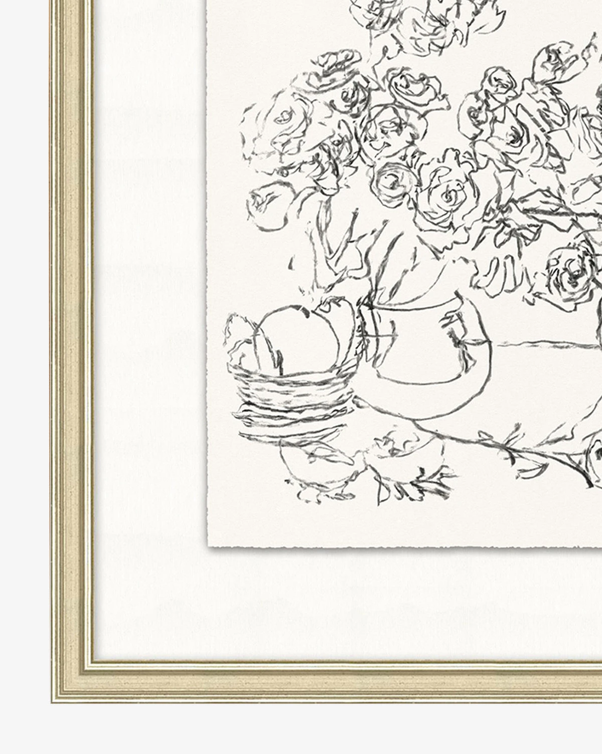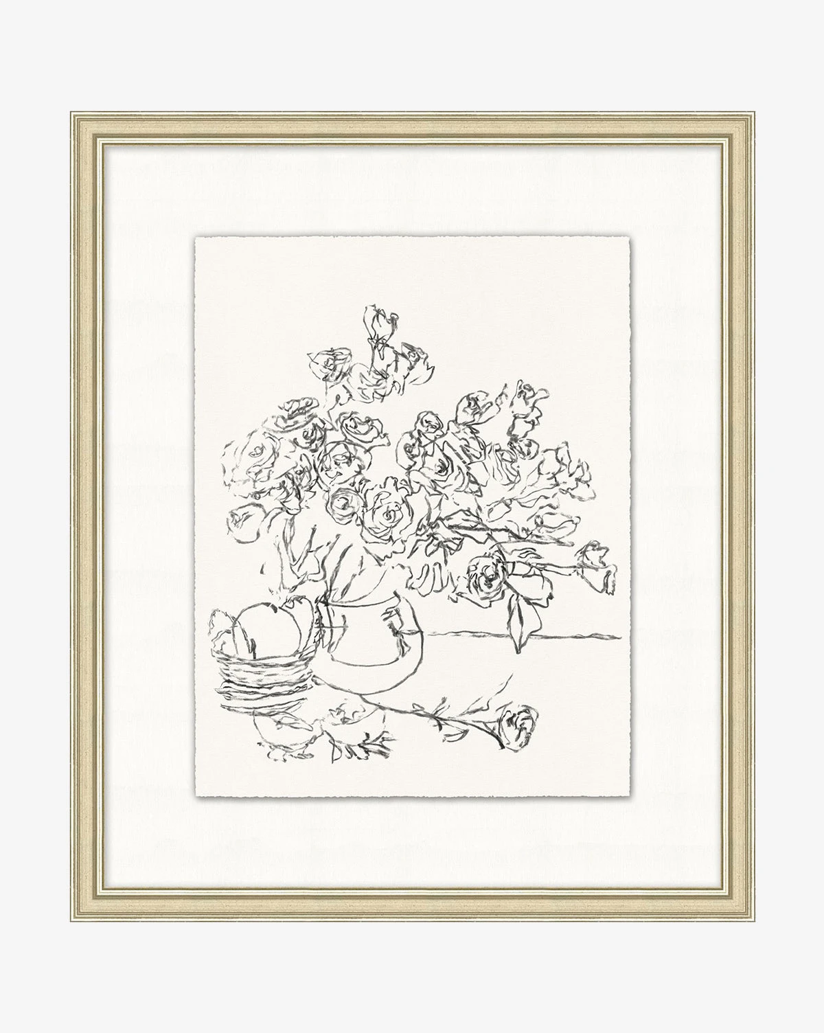 With expressive linework and a full composition, Capri I has a delicate yet inviting feel. The floral still life depicts an overflowing vase, highlighting the movement of the cut flowers on the tabletop. Framed in a wood frame with a pewter finish, the piece is a giclee print on watercolor paper.