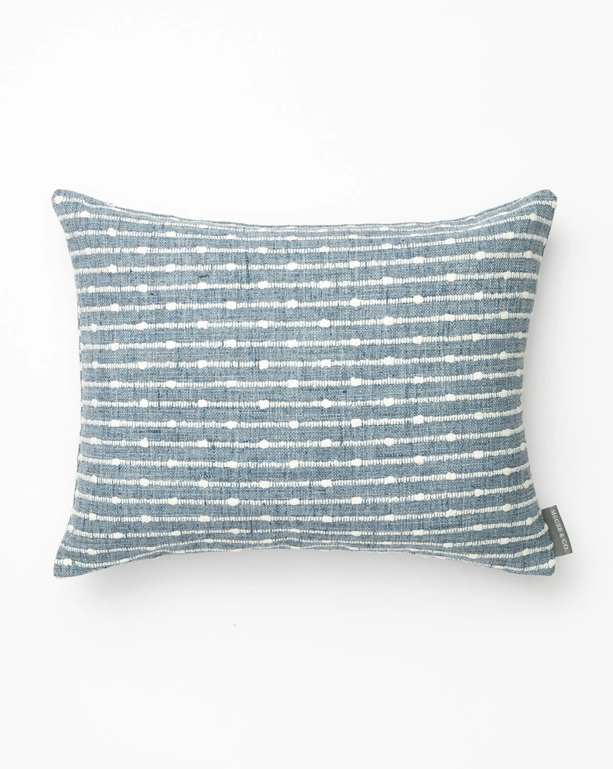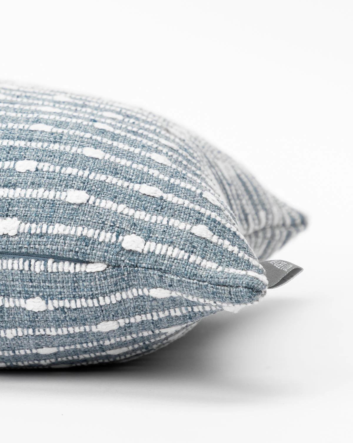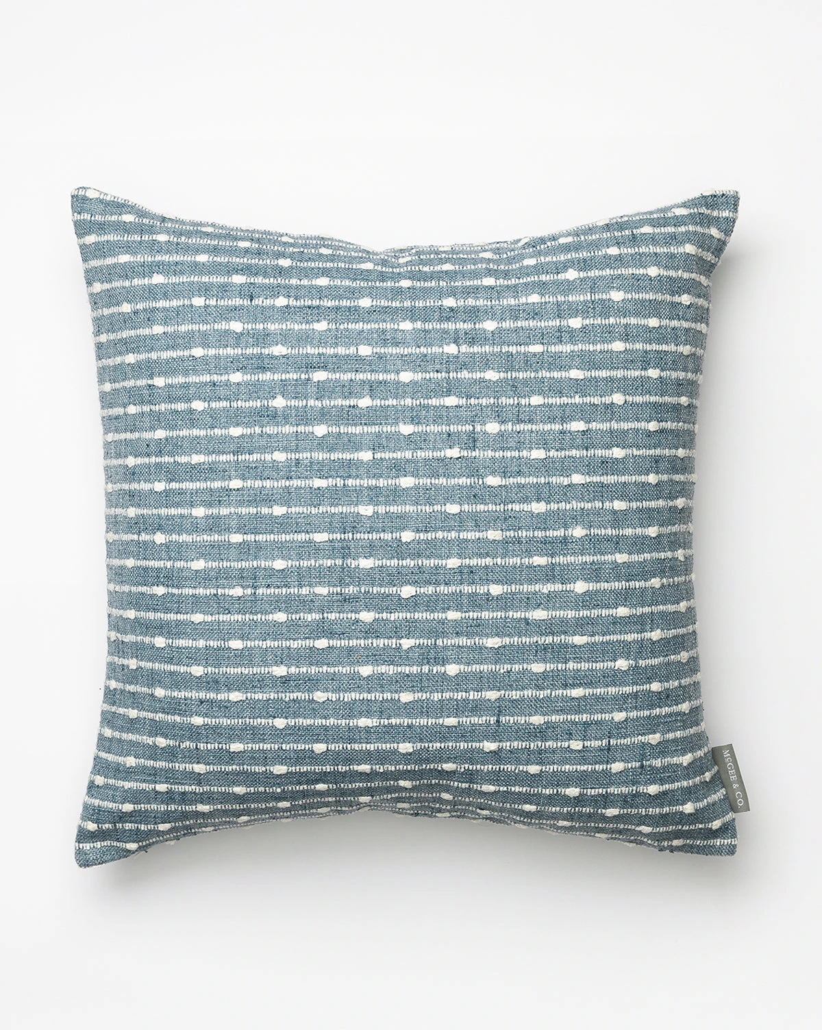 Detailed thread work gives the Claudette Blue Pillow Cover its unique character. Available in a beautiful colorway, this textile has a pattern of soft stripes punctuated with dots of heavy thread work that make a simple statement, lending versatility to changing styles in children’s bedrooms.
