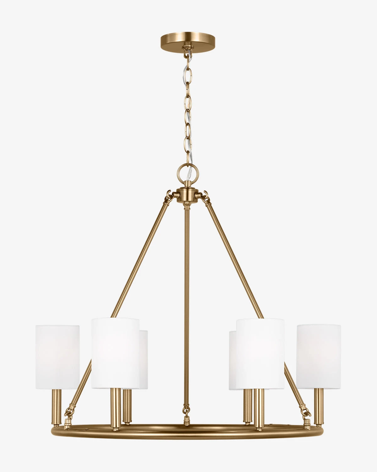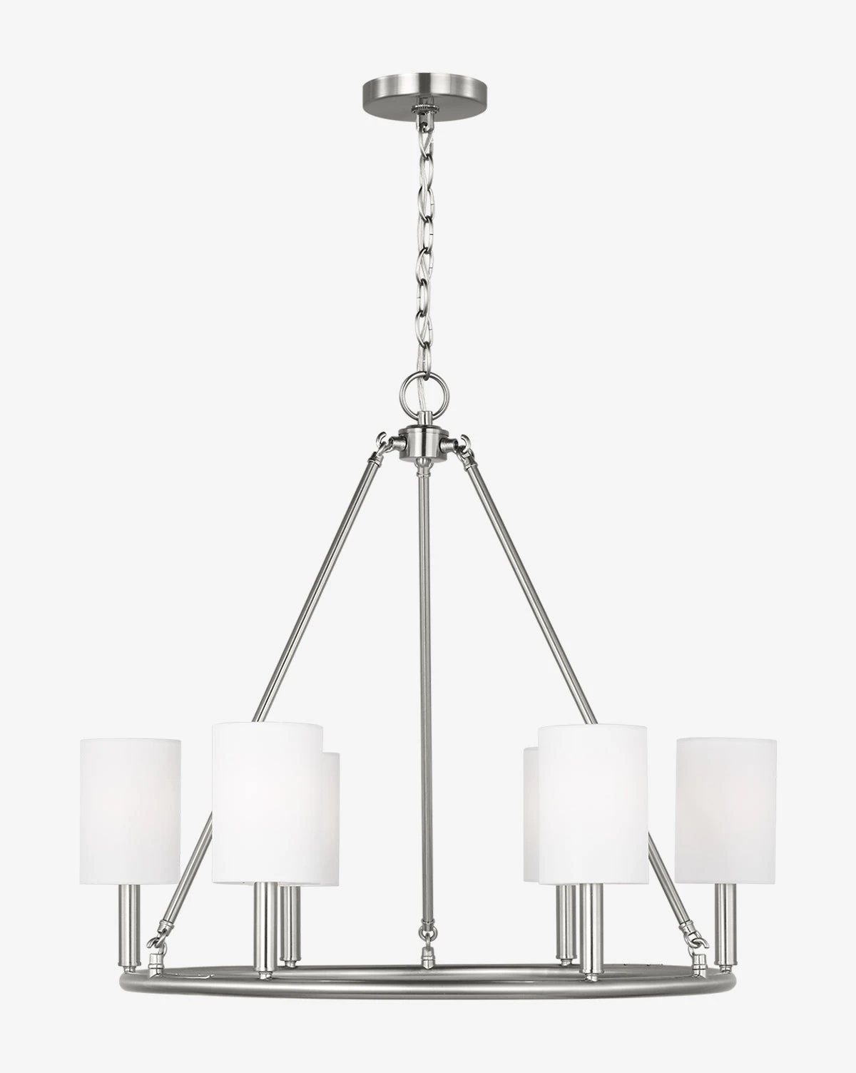 The Egmont Chandelier is inspired by the traditional chandelier but given a modern update. Sleek lines and an open frame holding white linen shades make for a beautiful accent for the entryway, dining, or kitchen area.