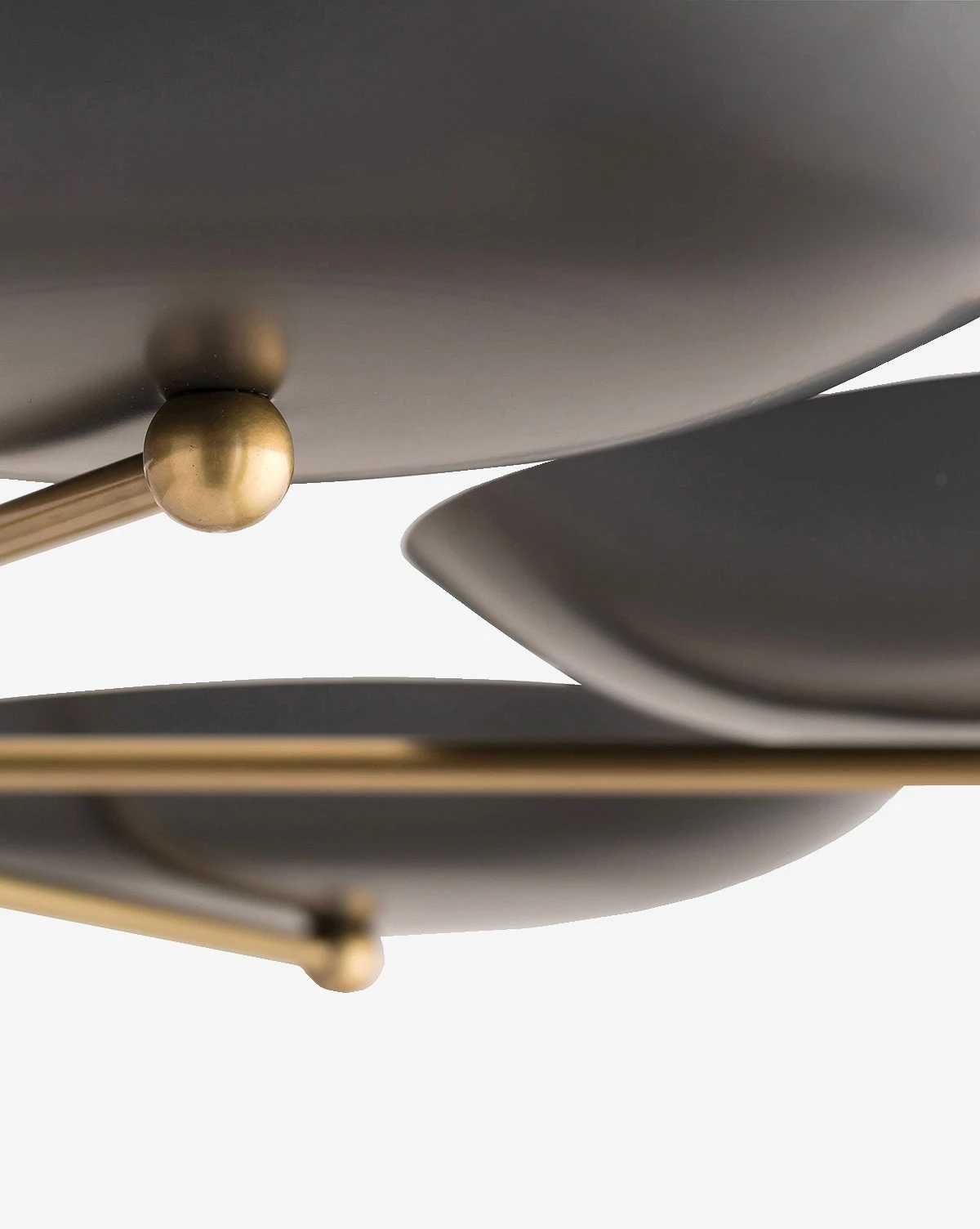 The Griffith Chandelier’s mid-century influence and versatile detailing makes it easy to mix styles in any home.  Its antique brass frame, carrying six upward facing bronze shades, creates great contrast while directly the light evenly upward.