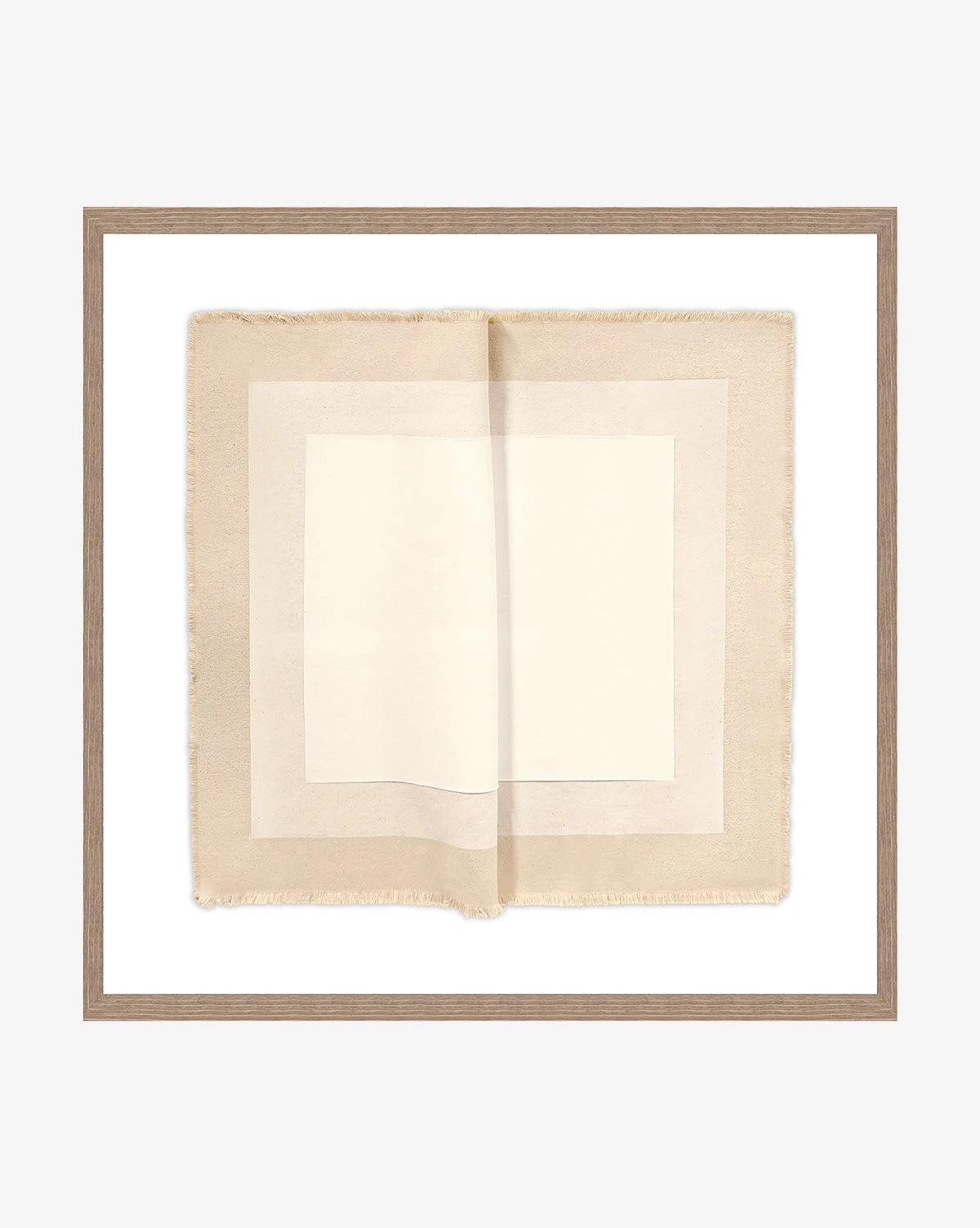 With three-dimensional texture, Mind Division I is a hand painting on fabric. Its frayed edges and folded element bring dimension and detail wherever it is placed. Framed in natural wood, museum-quality materials elevate your decor. Â