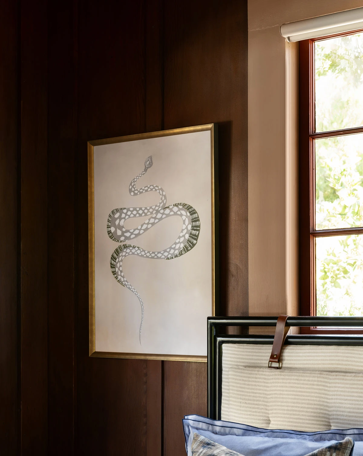 A colorful depiction of a snake, Serpent II is captivating and expressive, reminiscent of imaginative illustrations. Framed within a wood frame with a scaled texture gold finish, the piece is a charming accent to any children’s room.Â
